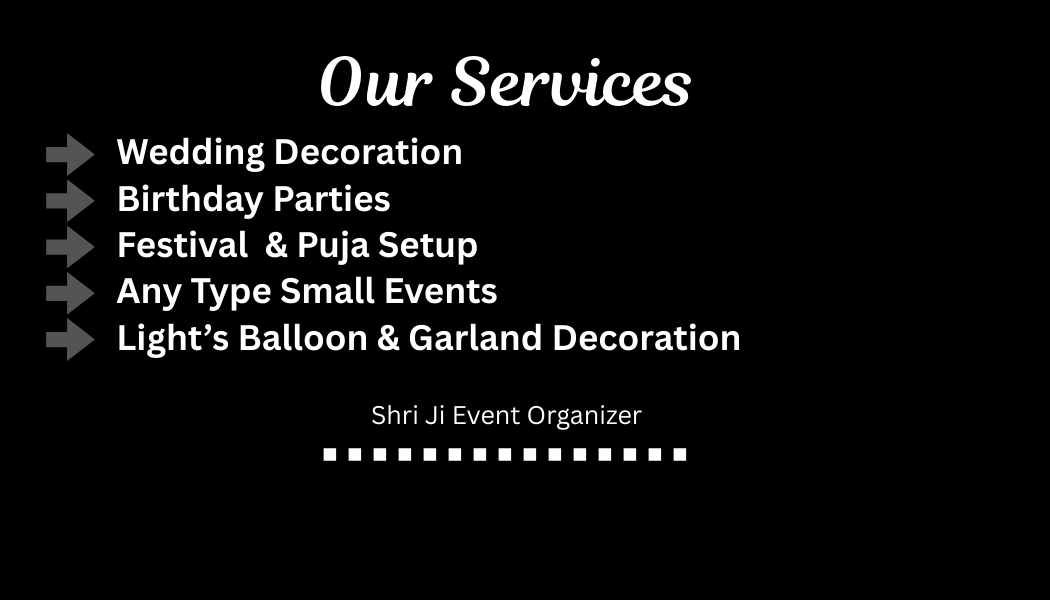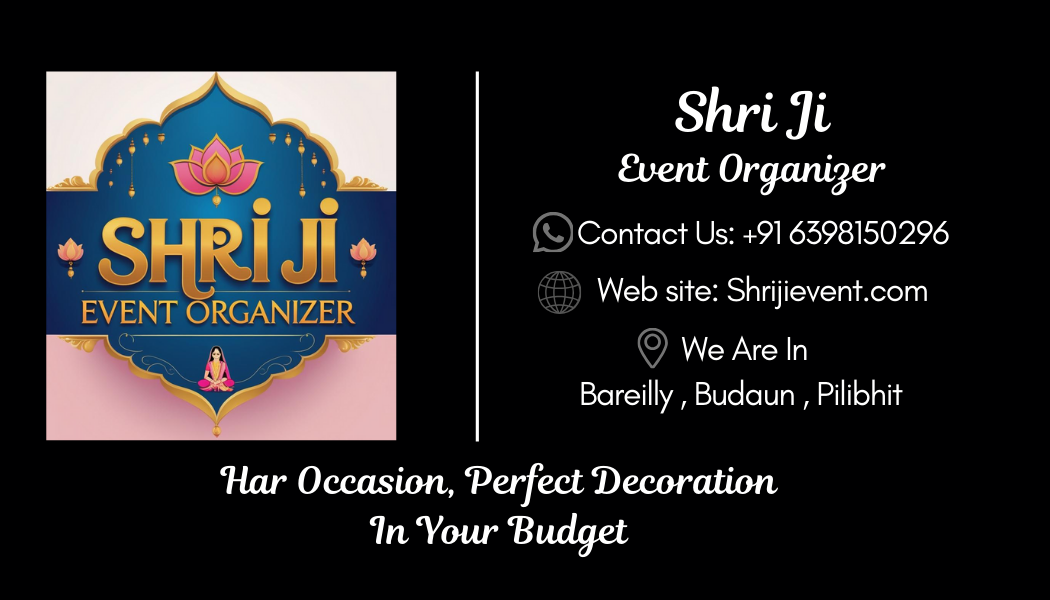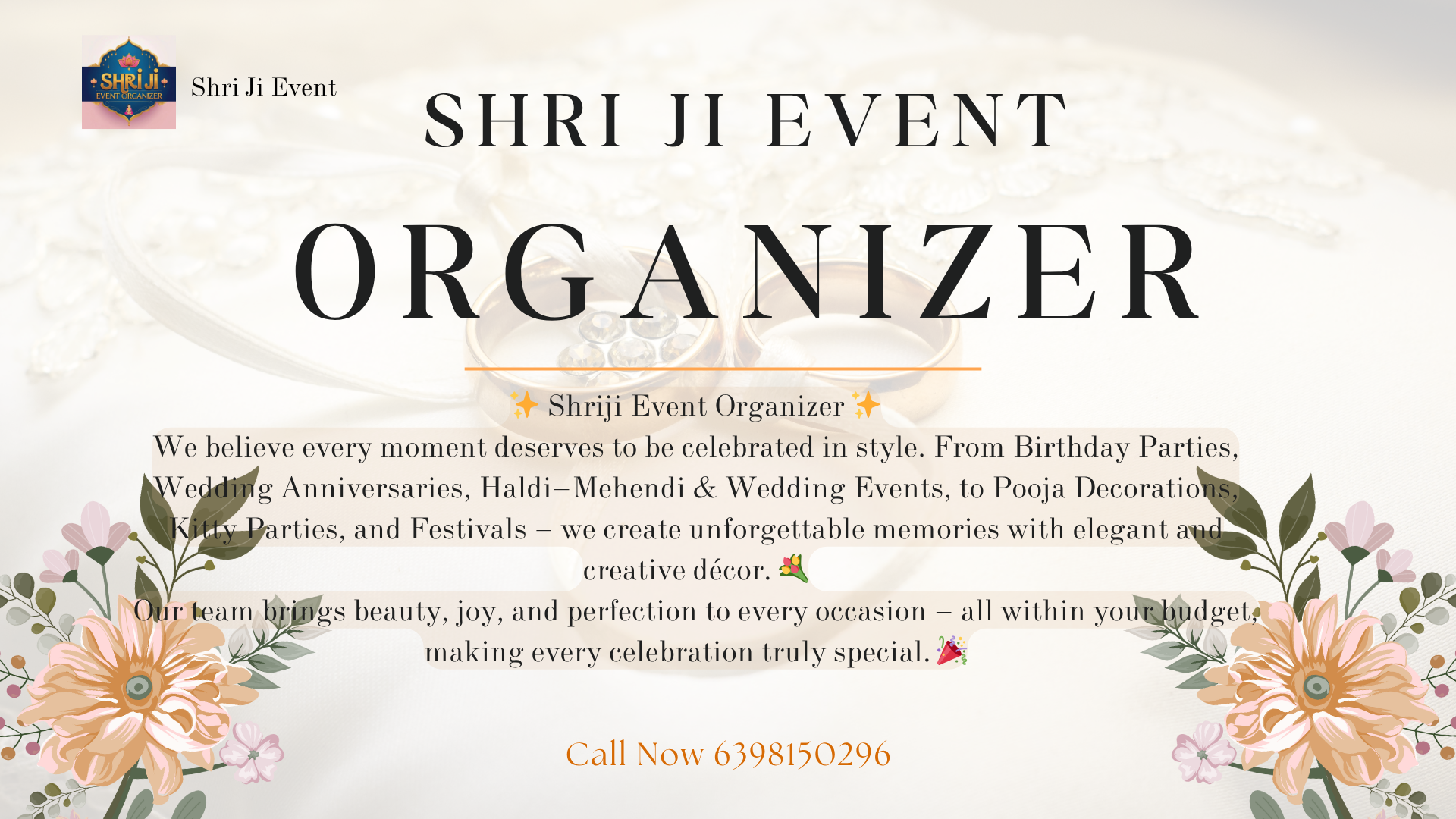 Birthday PartiesMake Every Birthday Extra Special with Colorful & Creative Decorations.Book NowBirthday PartiesMake Every Birthday Extra Special with Colorful & Creative Decorations.Book NowBirthday PartiesMake Every Birthday Extra Special with Colorful & Creative Decorations.Book NowBirthday PartiesMake Every Birthday Extra Special with Colorful & Creative Decorations.Book Now Wedding AnniversaryCelebrate Love with Elegant Anniversary Decorations – Memorable Moments, Beautifully Crafted.Book NowWedding AnniversaryCelebrate Love with Elegant Anniversary Decorations – Memorable Moments, Beautifully Crafted.Book NowWedding AnniversaryCelebrate Love with Elegant Anniversary Decorations – Memorable Moments, Beautifully Crafted.Book NowWedding AnniversaryCelebrate Love with Elegant Anniversary Decorations – Memorable Moments, Beautifully Crafted.Book Now Wedding EventsWe create unforgettable wedding moments with stunning and elegant decorations.Book NowWedding EventsFrom the vibrant Haldi and colorful Mehndi to the joyful Mahila Sangeet, traditional Tel Rasam.Book NowWedding EventsGrand Wedding Ceremony & Reception, we make every event beautiful, memorable, and full of celebration.Book NowWedding EventsGrand Wedding Ceremony & Reception, we make every event beautiful, memorable, and full of celebration.Book Now Festival DecorationWe bring festive vibes to life with colorful lights, flowers, and creative themesBook NowFestival DecorationFrom Diwali, Holi, Navratri, Ganesh Chaturthi to every special celebration, we make your festivals brighter, joyful, and memorable.Book NowFestival DecorationFrom Diwali, Holi, Navratri, Ganesh Chaturthi to every special celebration, we make your festivals brighter, joyful, and memorable.Book NowFestival DecorationFrom Diwali, Holi, Navratri, Ganesh Chaturthi to every special celebration, we make your festivals brighter, joyful, and memorable.Book Now Office & Shops DecorationShri Ji Event Organizer adds charm to your workspace and shops with elegant Book NowOffice & Shops Decorationcreative decorations. From festive themes to grand openings, we design stylish setups with lights, flowers, and unique décorBook NowOffice & Shops Decoration create a welcoming and vibrant atmosphere.Book NowOffice & Shops Decoration create a welcoming and vibrant atmosphere.Book Now Other DecorationWith Shri Ji Event Organizer, you can get any decoration of your choice. Book NowOther DecorationWhether it’s a small party, home function, shop opening, pooja, or any special celebration,Book NowOther Decorationwe decorate it beautifully to make your moments unforgettable.Book NowOther Decorationwe decorate it beautifully to make your moments unforgettable.Book Now